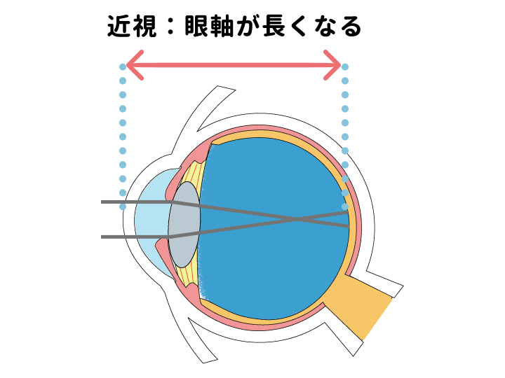 近視は眼球が楕円形に伸び(眼軸が伸びる)、ピントの位置がずれることで生じ、一度眼軸が伸びてしまうと、戻ることがありません。