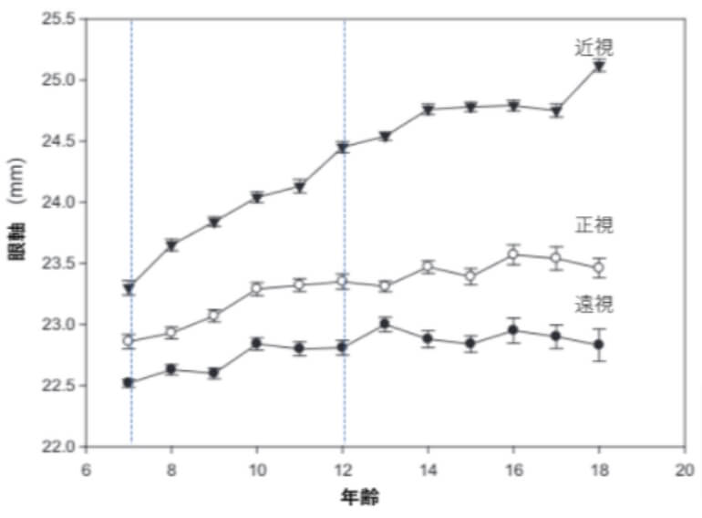 近視の原因になる眼軸伸長は7歳から12歳で著しく進行し、20代後半まで緩やかに続くと報告されています。このことからも学童期からの治療介入が重要であると考えられています。